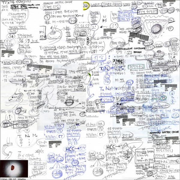 사진가-의사의 눈과 손과 기억과 경험, 사진기록의 종합인 <blog : surgical diary>는 외과의사가 특별하게 공개하는 비망록이다. 이 작업은 병원 밖의 사람들이 해독할 수 없는 기호(의학 전문 용어, 자료 사진, 바코드, 환자ID, 수술기구 등)들과 사진가-의사의 고유한 서명, 환자들의 앨범에서 가져 온 사진들로 구성된다. 일상생활의 소소한 기록이 보통의 일기라면, 노상익의 수술(외과)일기는 잘 알 수 없고, 볼 수 없었던 외과의 내밀한 기록이다. 그런데 그 기록은 발생의 원인이 아직까지 불분명하고, 그래서 재현이 불가능한 ‘암’이 주제이다. 누구나 알다시피, 사진은 세계를 지각하는 방식을 근본적으로 바꾸어 놓았다. 표상 불가능한 것들을 눈앞에 보이게 해주는 사진은 그 경이로운 기술로 ‘과학자들의 망막’이라 일컬어지기도 했다. 에밀 졸라는 ‘어떤 것이 사진으로 찍힌 것을 보기 전에는 그것을 정말로 보았다고 주장할 수 없다’고 말하기까지 했다. 이렇듯 사진은 육안으로 본 것뿐만 아니라 볼 수 없었던 것까지 보게 하여 새로운 학문에 대한 열망에 들뜬 19세기의 과학자들에게 실증의 도구가 된다. 육안으로 식별되지 않는 것들을 표상의 역사로 들여와 주의를 집중시키고, 현실을 인식하도록 유도한 사진은 사물의 실재를 생생하게 보유한 이미지였기에 처음 출현했을 당시부터 선망의 도구였다. 그 연속선상에서, 외과의사인 노상익은 암세포가 발생한 지점을 주위 장기와의 관계에서 어떻게 보여줄 수 있을지 고민했다. 수술 필드에서 중심이 되는 사진은 집도의가 직접 찍어야 제일 확실했던 것이다. 수술실 조명의 캘빈도를 파악하는 것은 기본이고, 카메라가 들어가야 할 때와 보여주는 방식까지 세밀하게 점검해야 했다. 결국 자기 손으로 직접 수술한 환자들에 대한 꼼꼼한 도큐먼트가『Biography of Cancer』연작의 첫 계기가 된다. 단순히 이미지를 제작하는 것이 아닌, 환자의 병을 치료하는 의사이자, 목격자, 사진가이자 기록자의 역할을 성실하게 수행한 것이다. 그의 손이 직접 닿았던 개별 환자들의 몸과 임상차트 기록 및 검사결과는 ‘by Jason'(노상익의 서명)에 의해 새로운 맥락으로 몽타주 된다. 이 부분은 어떠한 사진작업과도 비교 불가능한, 노상익이 선취해 낸 독보적이고 특별한 영역이다. ‘그때 분명히 존재했던’ 것들에 외과의사의 손과 빛이 닿아 카메라에 입력된 것이기 때문이다.
